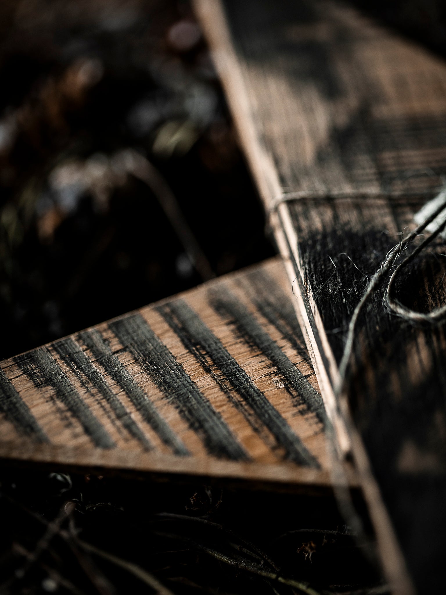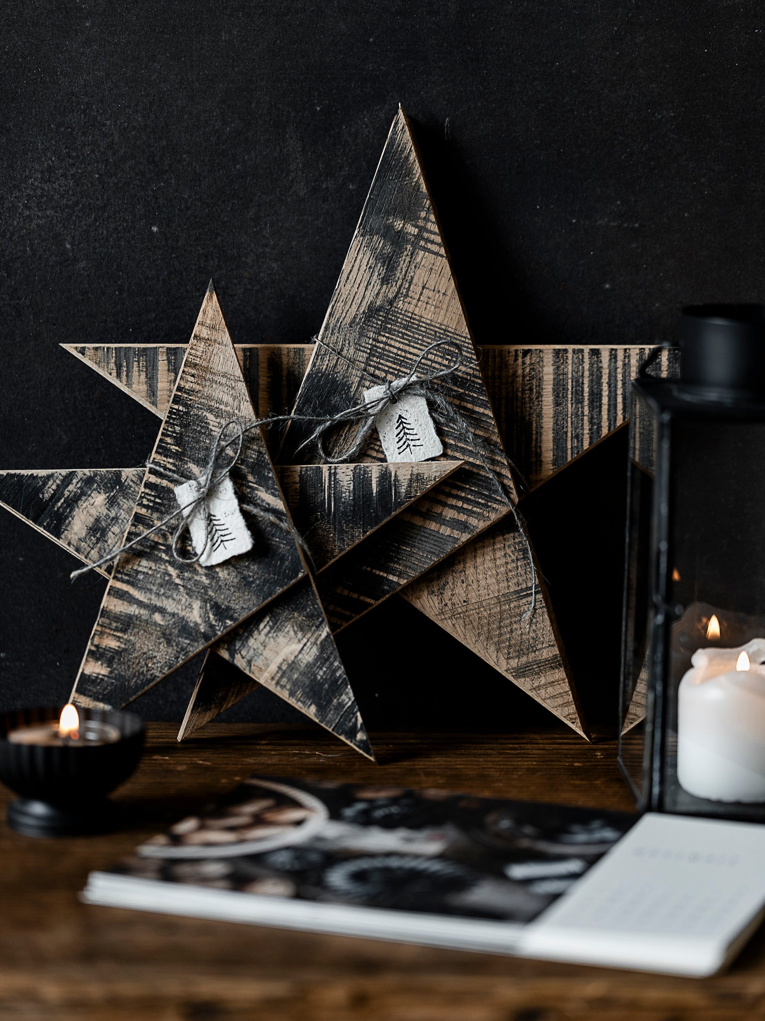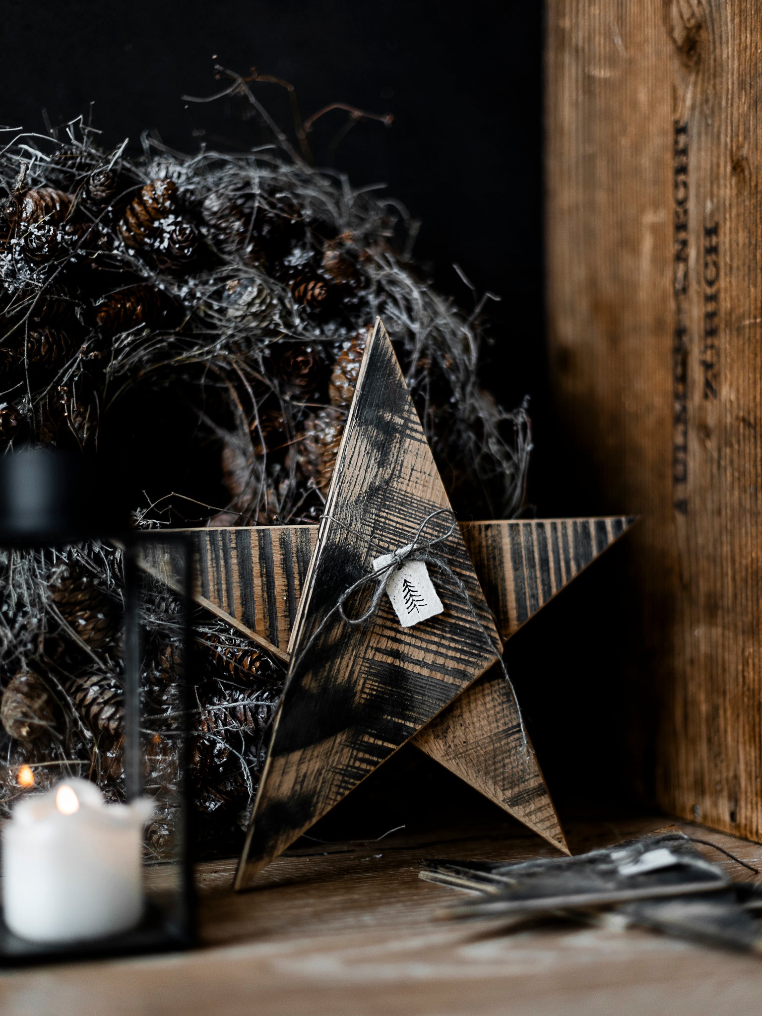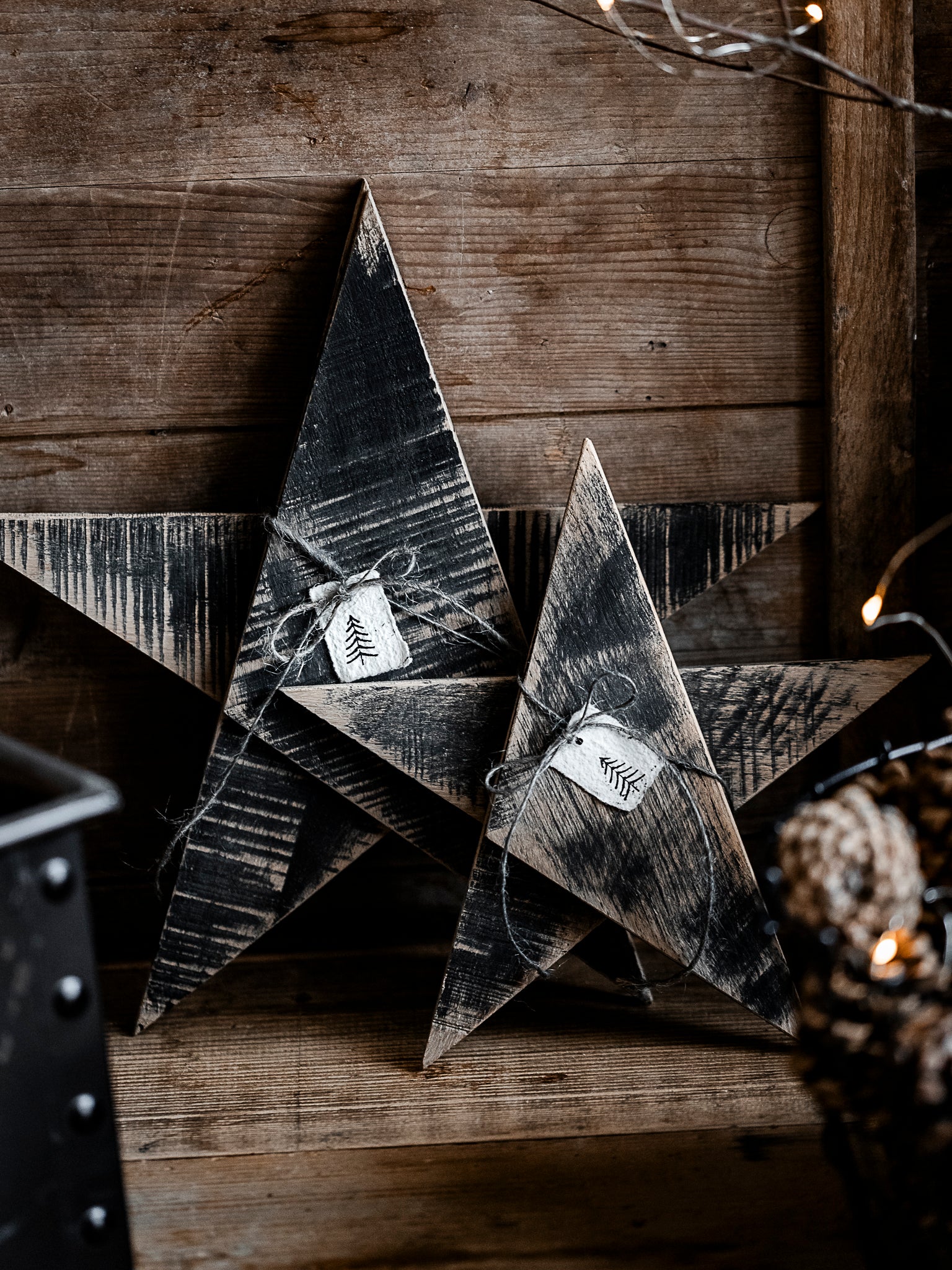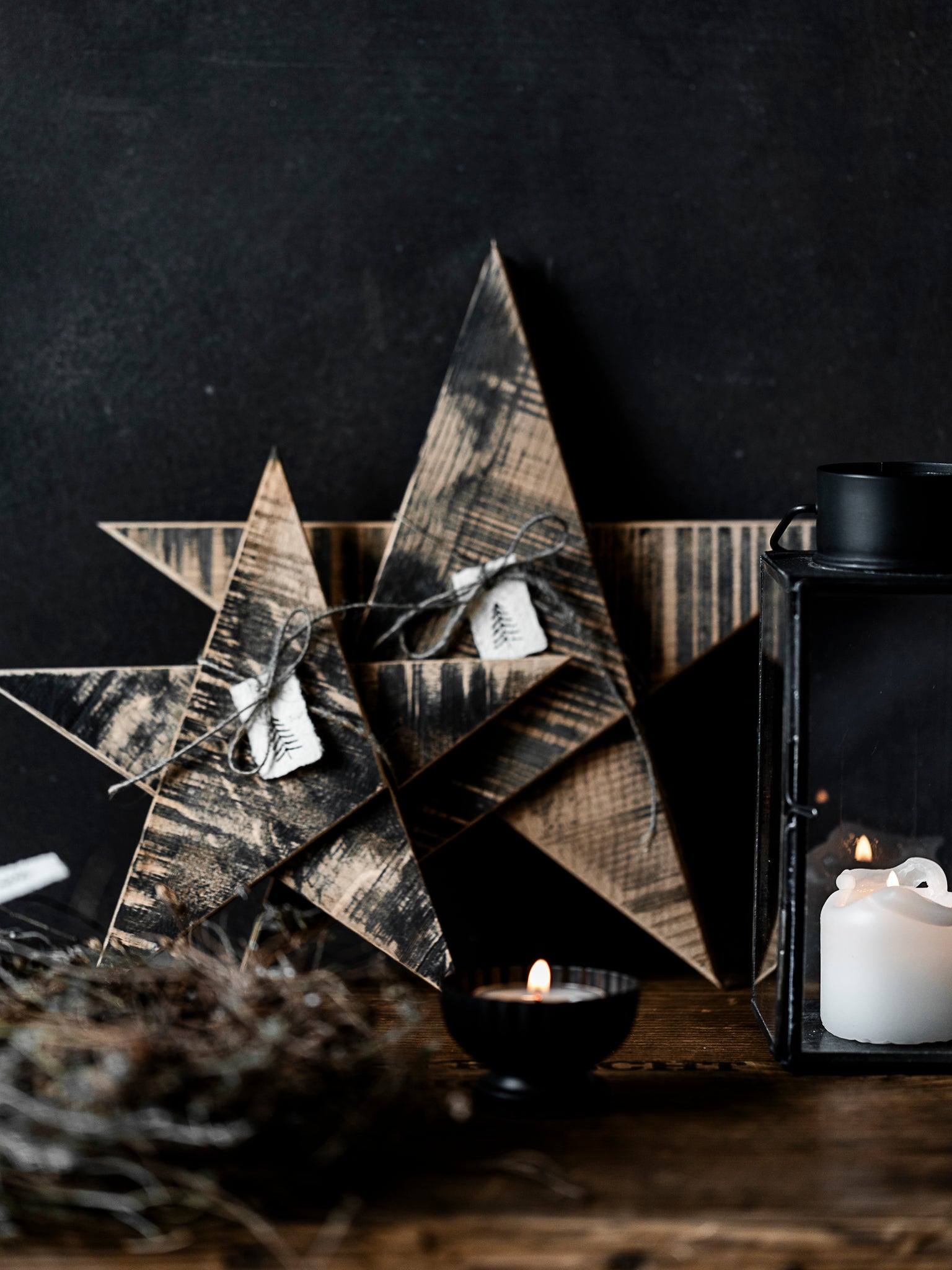 Siehst du die Strukturen der Bandsäge, wie sie durch das harte Holz gerattert ist? Diese dünne Scheiben, waren für sie und mich eine echte Herausforderung. Drei dünne Holzplatten, geschnitten zu Dreiecken, zusammengefügt zu einem Stern. Zur Auswahl stehen dir zwei Grössen.