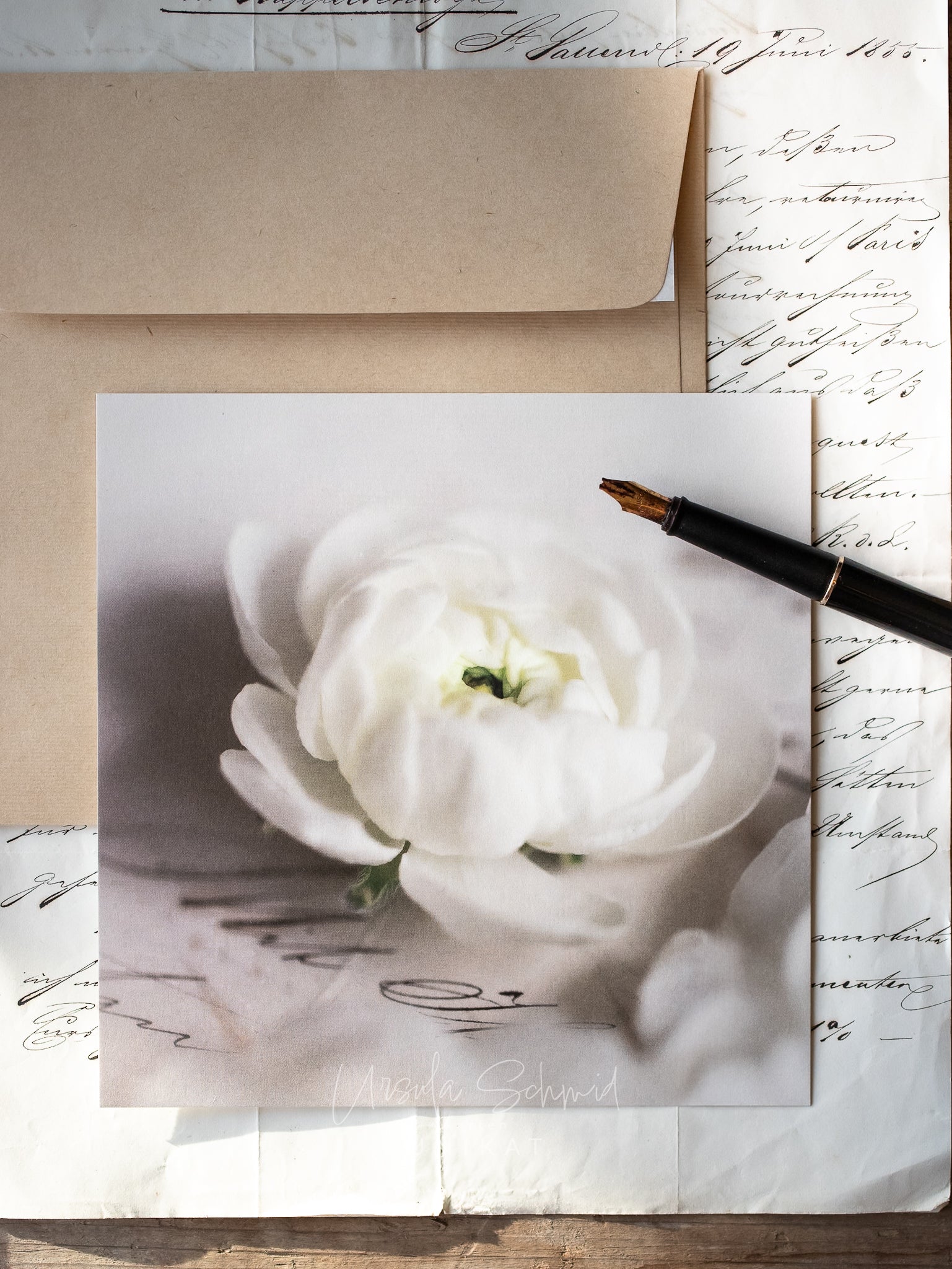 Einseitige Karte, mit weisser Rückseite. Ein feines, mattes Papier, welches beim Schreiben begeistert.