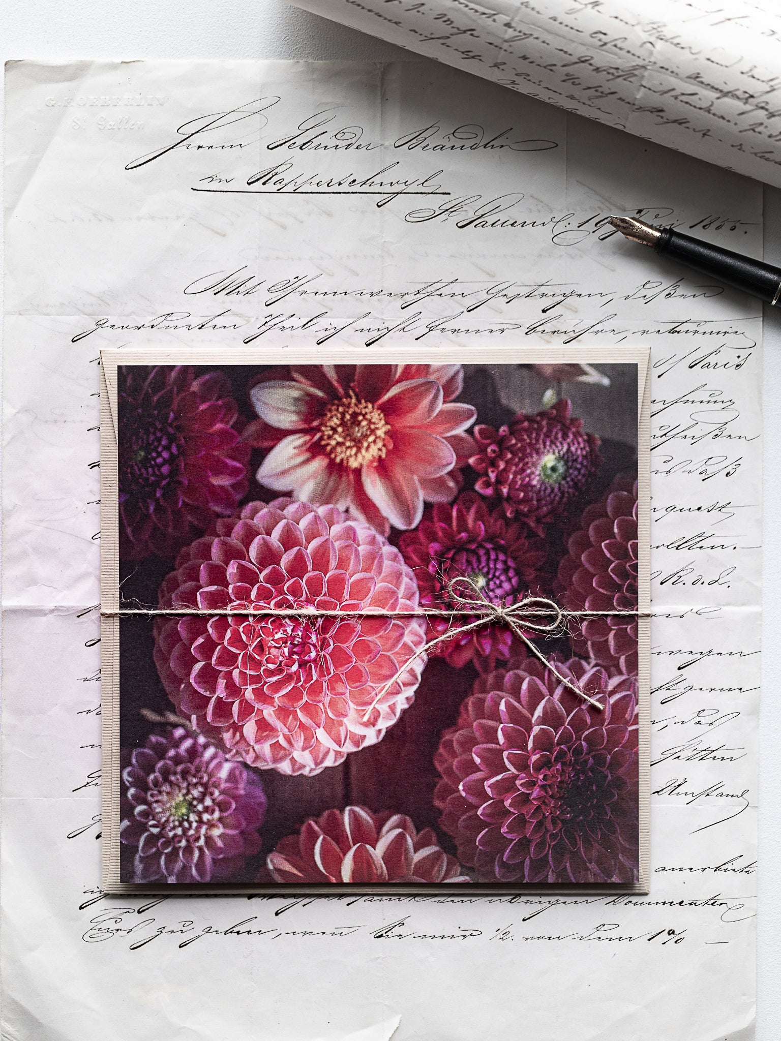 4 einseitige Karten, mit weisser Rückseite. Ein feines, mattes Papier, welches beim Schreiben begeistert.