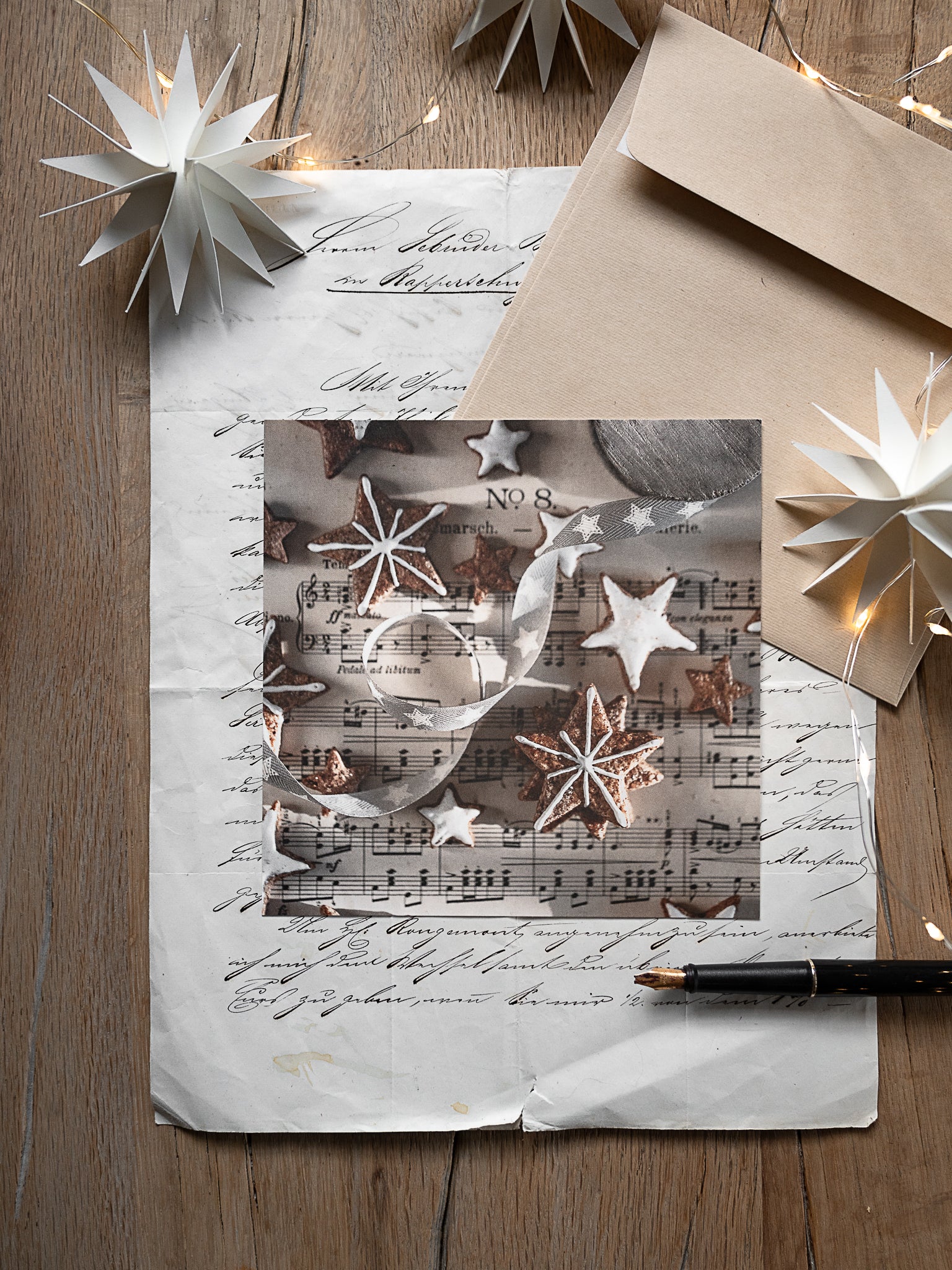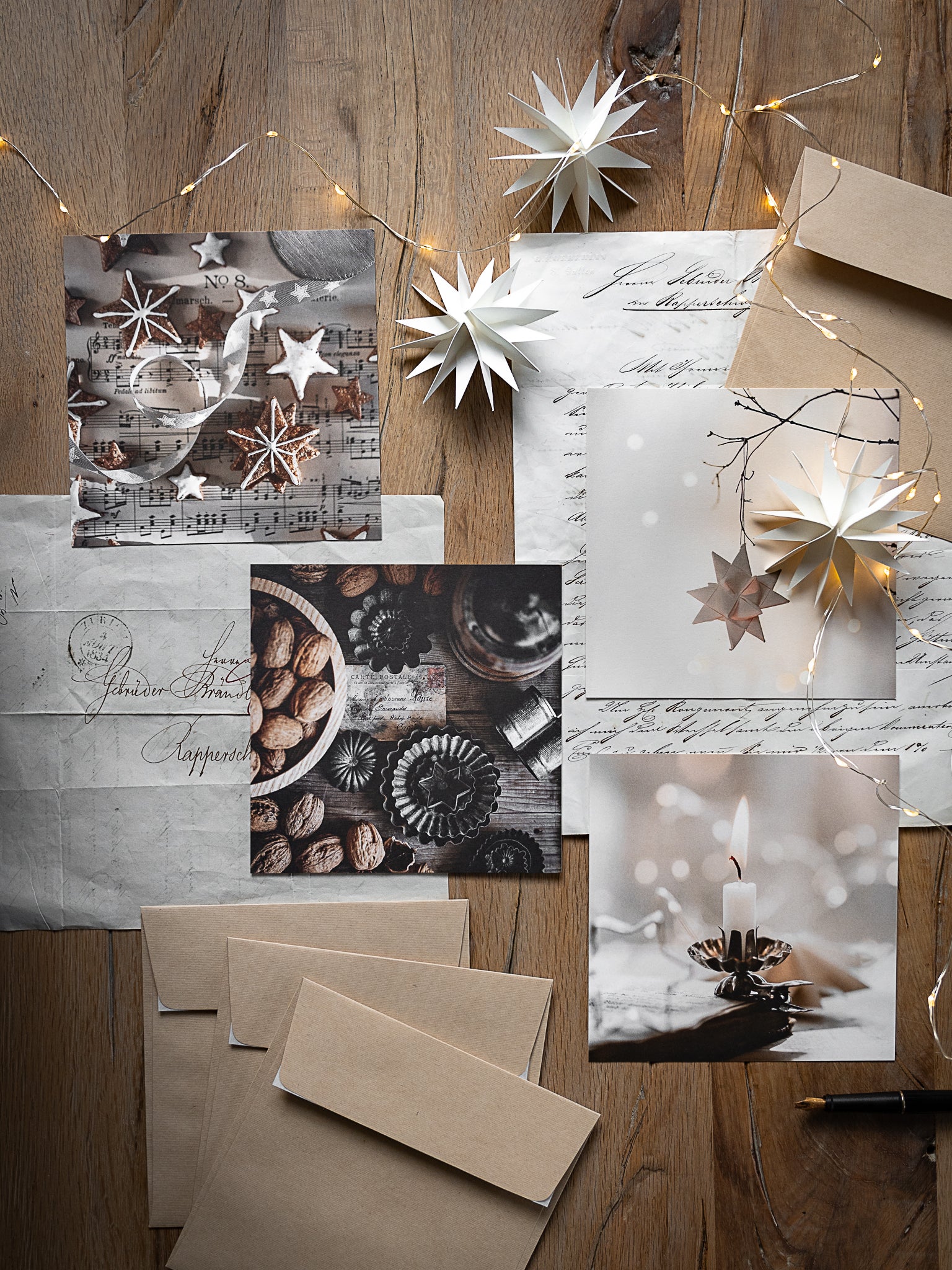 4 einseitige Karten, mit weisser Rückseite. Ein feines, mattes Papier, welches beim Schreiben begeistert.